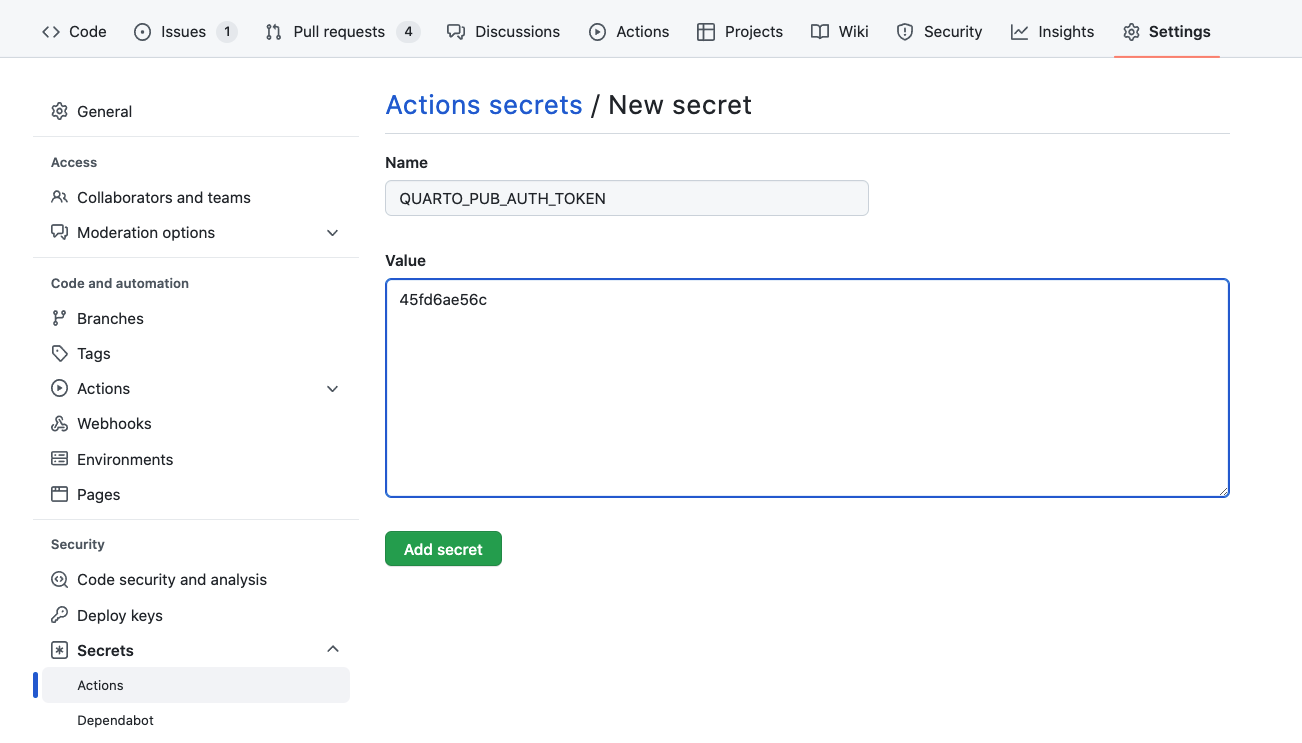 Click the button and add the personal access token from step 1 as a secret named QUARTO_PUB_AUTH_TOKEN: